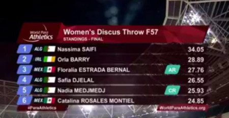 El primer lugar correspondió a Nassima Saifi de Argelia, con 34.05m, mientras que la plata fue para Orla Barry de Irlanda, con 28.89m.