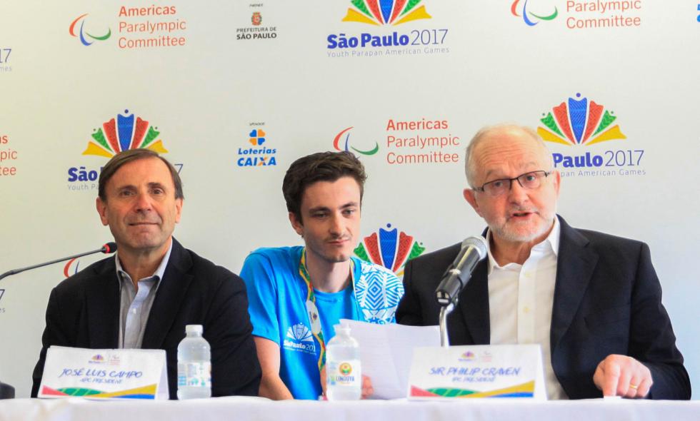 El presiente del Comité Paralímpico Internacional, Philip Craven, y el presidente del Comité Paralímpico de las Américas, Jose Luis Campo, participan en una conferencia de prensa durante la apertura de los IV Juegos Parapanamericanos de la Juventud.