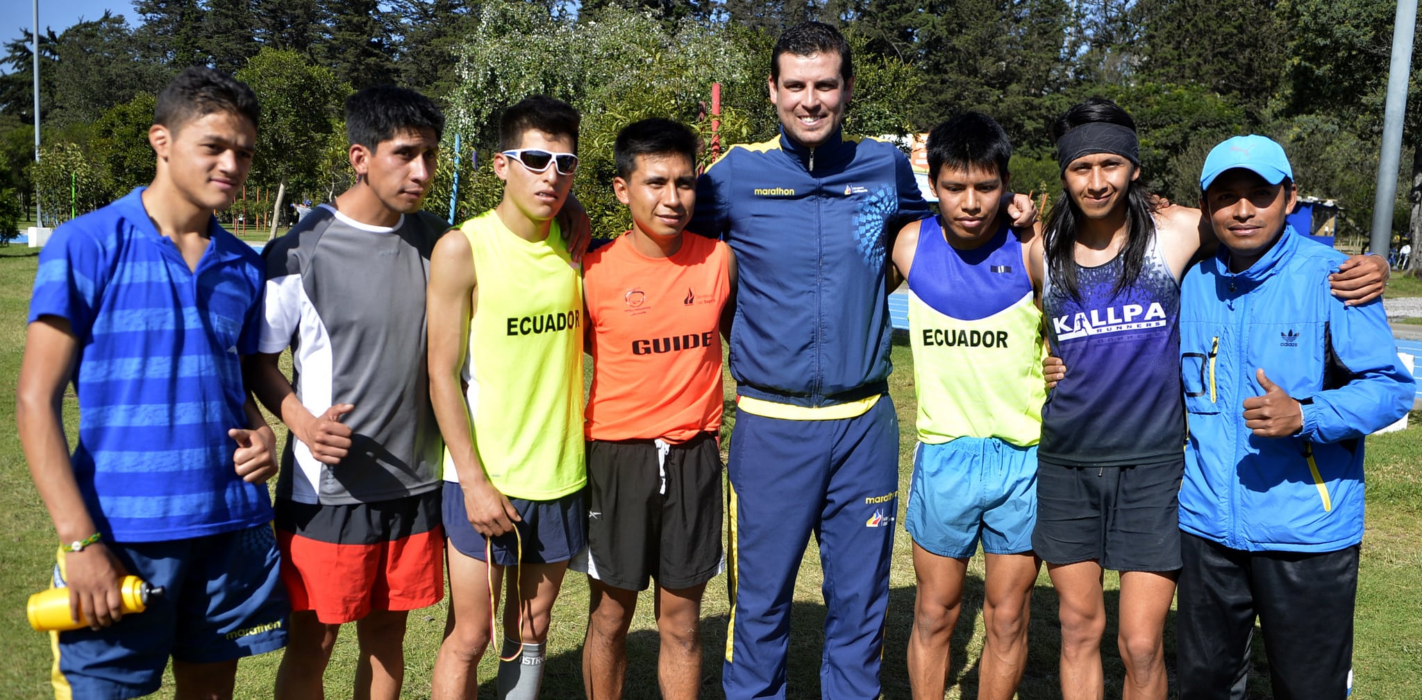Los atletas con discapacidad visual Sixto Moreta (segundo desde la derecha) y Darwin Castro (c), junto al guía Sebastián Rosero, pertenecen al plan de apoyo que ejecuta el Comité Paralímpico Ecuatoriano.