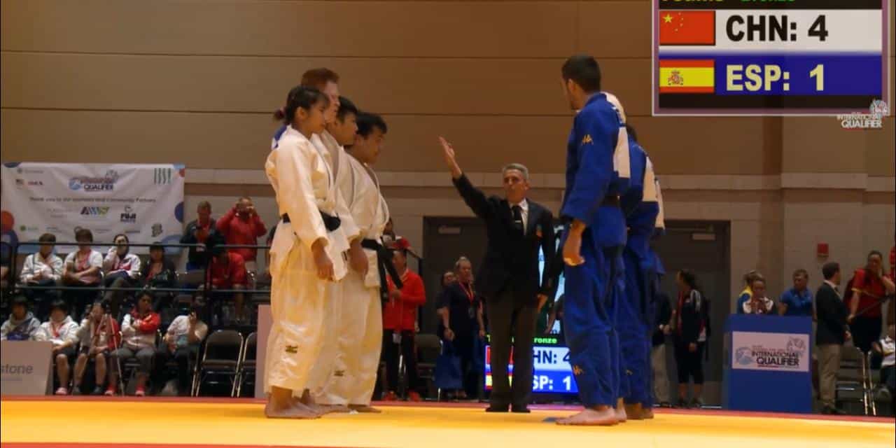 En el primer combate, en la categoría de -66 kilos Sergio Ibañez ganaba al chino Ma por ippon a falta de 52 segundos. En el segundo combate, Marta Arce en la catergoría de -63 kg no podía contra Wang al caer derrotada por ippon. En el último combate, Daniel Gavilán en la categoría de -81 kilos también perdía por ippon ante Wu, por tanto España finalizaba en quinta posición tras caer ante China en la lucha por el bronce por 1 a 4.
