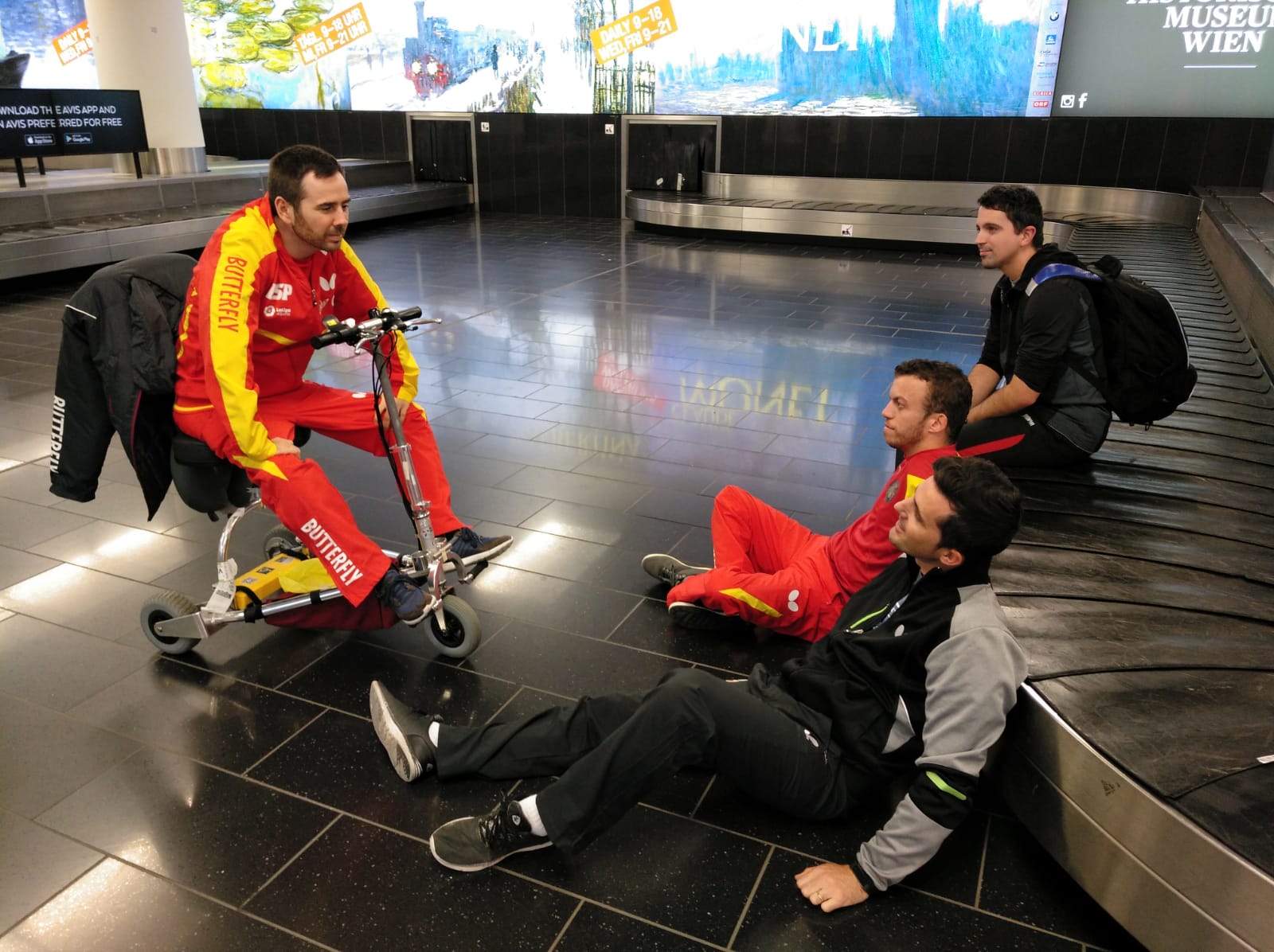 "El problema nos lo hemos encontrado al llegar aquí. Llevamos hora y media de cola en el aeropuerto de Viena para recuperar las maletas. En ese punto estamos, desde las 4.45 de la mañana levantados y son las 16.20 y aún estamos en la cola. Ahora nos quedan aún cuatro horas de viaje hacia Eslovenia, y pasado mañana (el miércoles) comenzamos un Mundial sin saber si tendremos el material y la ropa, raquetas llevamos a mano pero hay jugadores en silla de ruedas que necesitan colectores y otros medicaciones que llevan en la maleta para su dia a dia, asi que en ese punto estamos", explicaba José Manuel Ruíz a dxtadaptado.com/ .