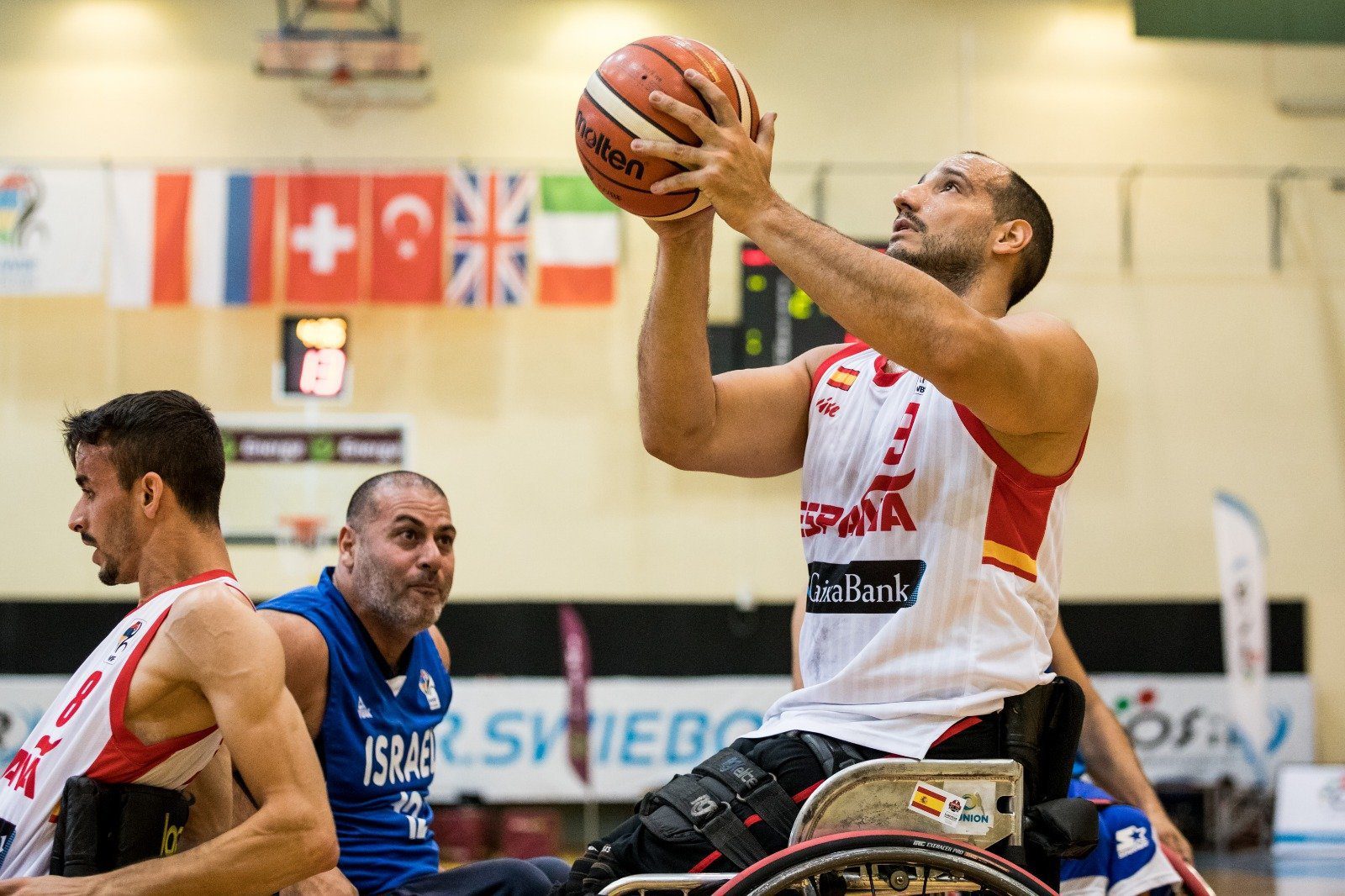 En la reanudación, tras la igualada de Shay Refael Haim, la ‘ÑBA’ sobre ruedas endosó un parcial de 6-0 liderado por Amadou Diallo y Zarzuela (19-13). No se arrugó Israel y entre Shabo, Haim, Bentolila y Dotan Meishar colocaron a su equipo a solo dos puntos (23-21). España había perdido lucidez ofensiva e intensidad atrás y Óscar Trigo se vio obligado a menear el árbol en busca de la reacción. Fue el toque de atención que necesitó la selección para dar un paso adelante. Y lo hizo abrazado a Agustín Alejos, que con 10 puntos fue un soplo de aire fresco para los suyos y neutralizó, hasta el descanso, la sublevación israelí (33-24).
