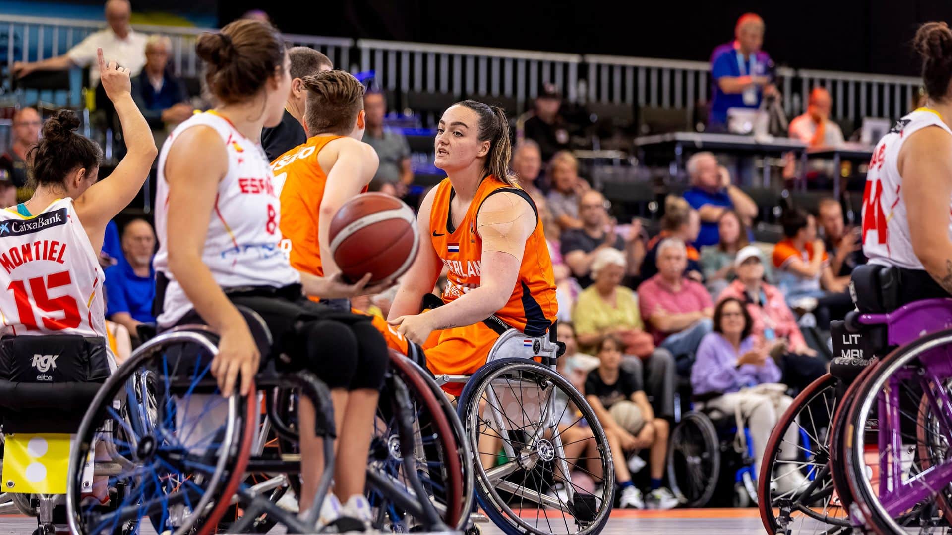 España salió sin complejos y valiente, sin nada que perder, llegando a tutear a la vigente campeona paralímpica, mundial y europea durante el primer cuarto. Con una defensa muy cerrada y solidaria, las de Franck Belen apenas encajaron tres puntos en casi cinco minutos, en los que fueron por delante en el marcador (4-3). Aunque poco a poco las holandesas empezaron a calentar las muñecas y a afinar la puntería (8-13).