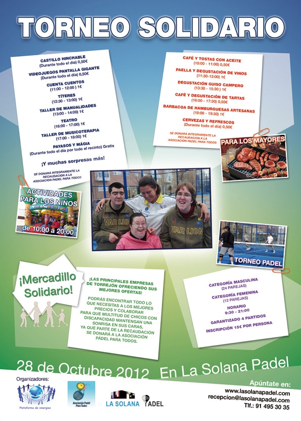 Asociación Pádel para Todos/Agencia Mediación. Las más de 60 pequeñas y medianas empresas que forman parte de la Plataforma de Sinergias de Torrejón de Ardoz quieren mostrar su compromiso con la integración de las personas con discapacidad organizando el I Torneo Solidario Pádel para Todos, que se disputará en el club La Solana el próximo 28 de octubre y que pretende convertirse en una fiesta familiar en la que habrá regalos, sorteos y actividades lúdicas para todos los asistentes.